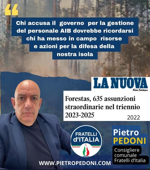 Durante la Giunta Solinas, l’Assessorato alla Difesa dell’Ambiente, guidato da Fratelli d’Italia con Gianni Lampis prima e Marco Porcu dopo, ha sempre rivolto un’attenzione particolare al problema, oltre a mettere in campo tutte le migliori soluzioni. Ricordiamo tra tutti ad esempio, i 6 milioni distribuiti ai comuni, i 24 mezzi per il Corpo Forestale e la dotazione dell’elicottero Puma oltre ad un piano di assunzione triennale per ringiovanire il personale di Forestas.